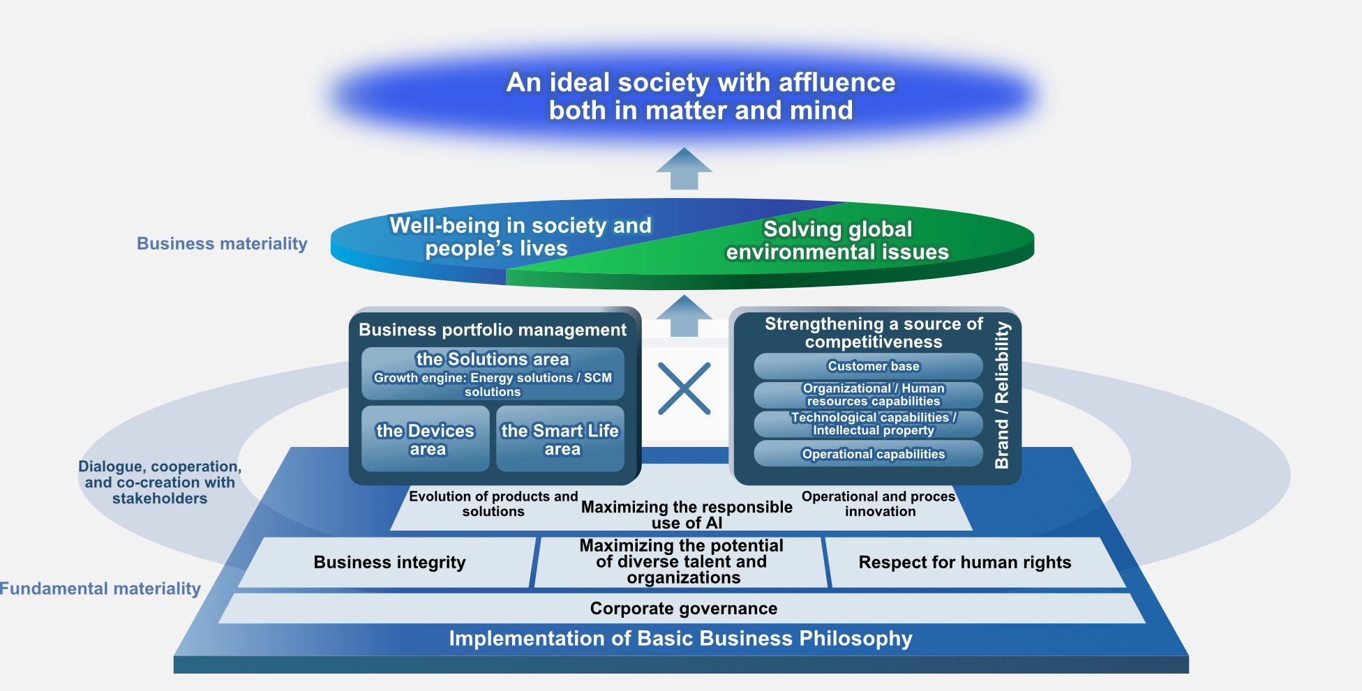 We have defined materiality (an essential element of this process) as referring to priority issues for creating value for society. We categorize materiality as either Business Materiality, which focuses on the creation of value through our business activities, or Fundamental Materiality, which is intended to build and strengthen the management foundation that supports these activities. By setting KPIs for each of these materialities and pursuing continuous improvement, we aim to achieve even greater value creation.
