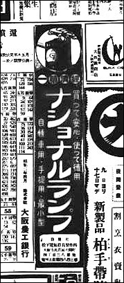 Panasonic's first newspaper ad. designed and phrased by Konosuke Matsushita, "National Lamps: Buy for Your Assurance, Use for Your Benefit."