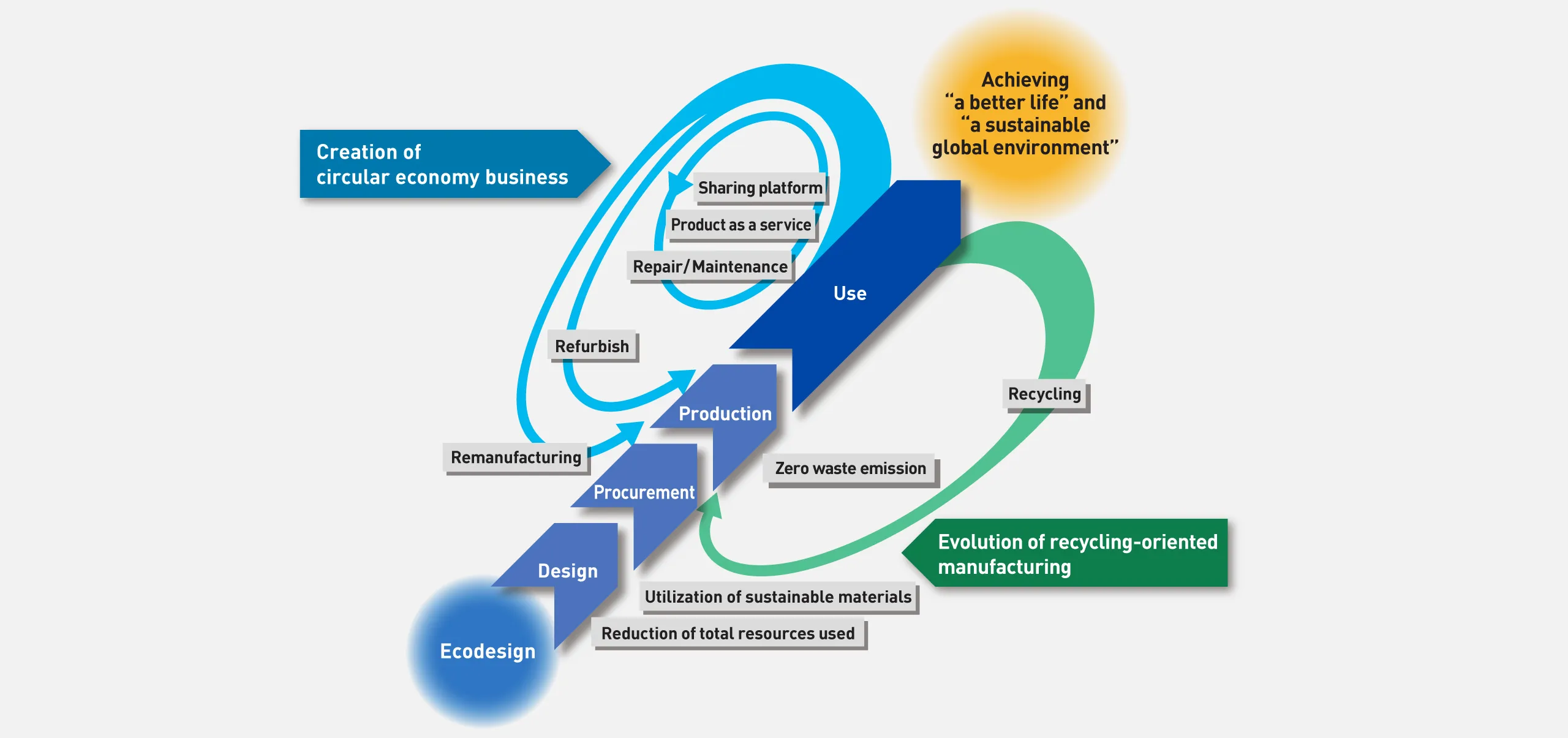 Along with changes in customer lifestyles, there is now a growing global trend for customers to use only specific functions of a product, rather than using or owning the whole product. Particularly in Europe, building a circular economy for sustainable economic growth has become a major economic strategy, in a move away from continuous resource consumption. Amid this development, the Panasonic Group is introducing the idea of circular economy and moving forward in efforts to promote effective utilization of resources and maximization of customer value.