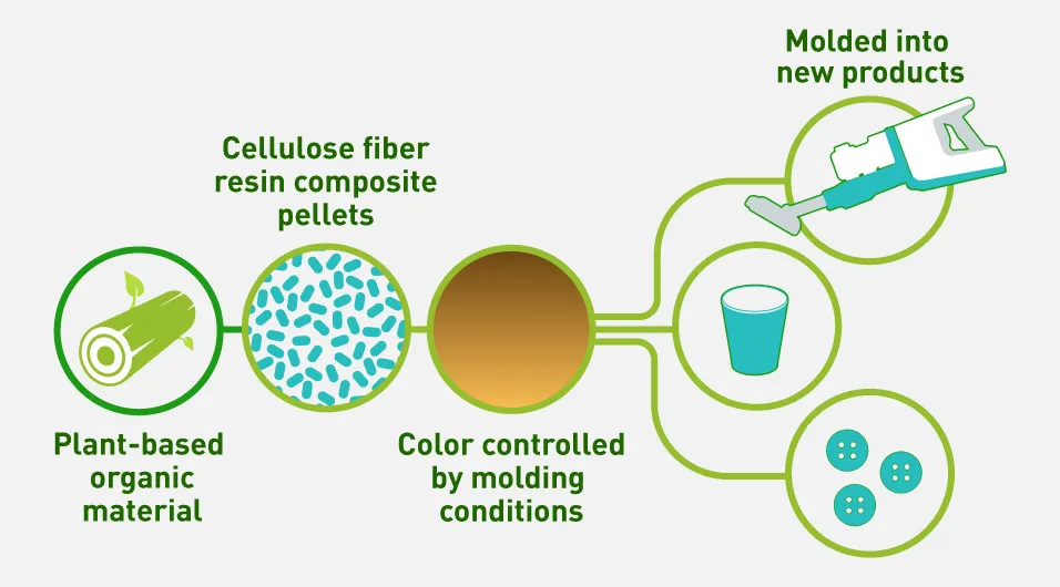 By extracting plant fibers (cellulose) from forestry thinnings and other hitherto-discarded plant resources and mixing them with resin at high density using our enhanced proprietary technology, we can leverage the properties of the raw materials to create a material with a wood-like texture and scent that can be processed into complex shapes. Through collaborative efforts with companies, local government bodies and other parties, this cellulose fiber resin is now being utilized in environmentally responsible products like reusable cups and buttons.