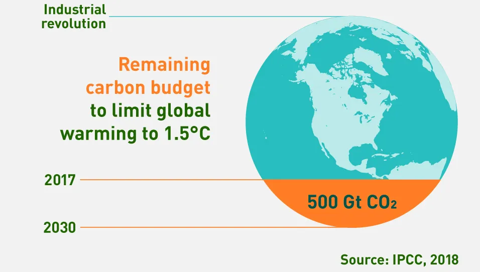 The world's carbon budget, meaning the maximum amount of CO2 emissions that could be generated without exceeding the 1.5ºC global limit set at the Paris Agreement, is approximately 500 gigatons. Without additional measures, at the current rate of reduction in CO2 emissions, this budget will be exhausted by 2030, necessitating emergency action.