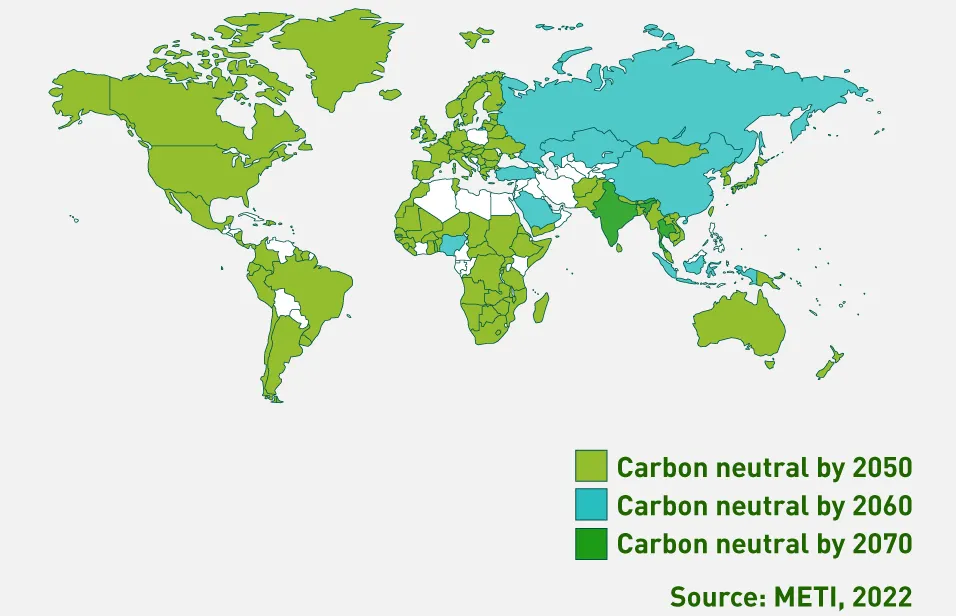 To address the critical situation regarding climate change, countries and regions worldwide are proactively declaring their commitment to carbon neutrality. Over 150 countries and regions have declared targets to achieve carbon neutrality by 2050, 2060, or 2070. If all these commitments are fulfilled, global CO2 emissions could be reduced by approximately 88%.