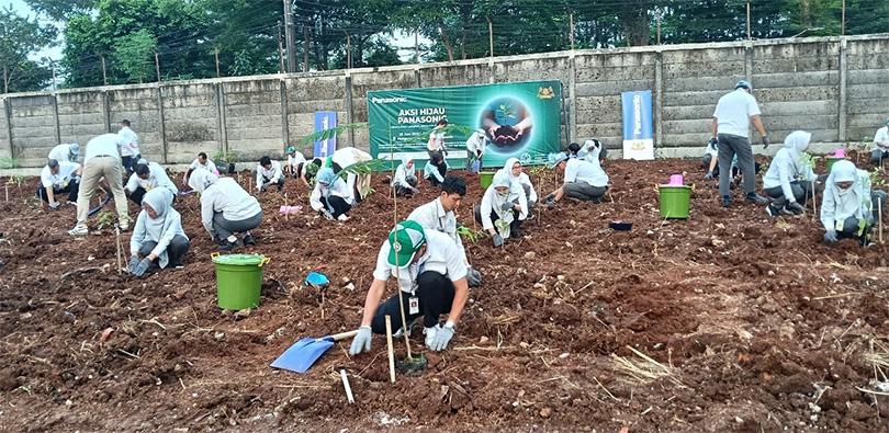 In celebration of Environment Month 2025, Panasonic Gobel Indonesia (PGI) and Panasonic Manufacturing Indonesia (PMI) hosted a tree planting event on 20 June. During the event, 200 mahogany and flamboyant tree seedlings were planted in the green belt surrounding the PMI factory, bringing the cumulative total to 1,000 trees since the launch of the “Every Step Forward, a Seed of Hope” initiative in 2023. Once fully matured, these trees are estimated* to absorb approximately 22,000 kilograms of CO2 annually.