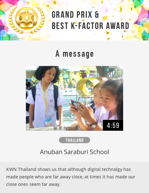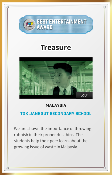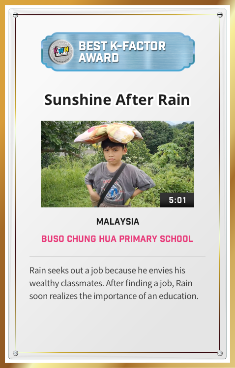 The KWN Kids Award is an award given to the video voted by the children who participated in the KWN Global Summit 2018. The first of its kind, this award was chosen by the children for each school category (Primary & Secondary Category).
