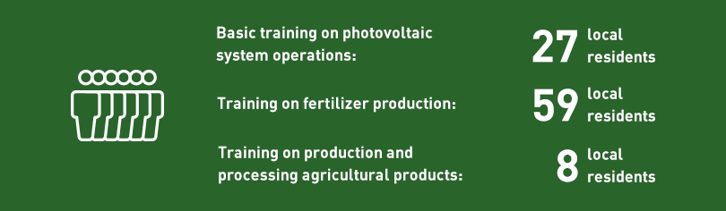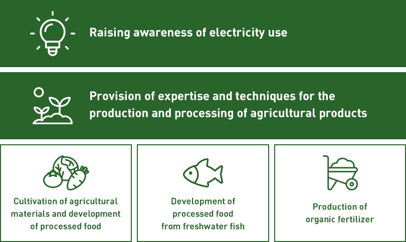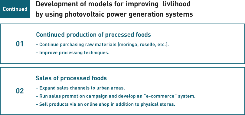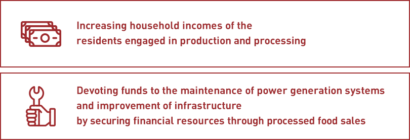 Towards the goal of making social impacts by achieving sustainable development of the communities, we designed participatory activities, involving the local communities. Our efforts yielded appreciable results, including the development of processed food from local agricultural products by using electricity generated from photovoltaic and energy storage systems.