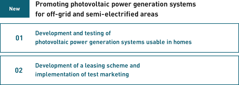 We launched a new project to promote photovoltaic power generation systems for off-grid and semi-electrified areas. To realize that, we will develop easy-to-use photovoltaic power generation systems for homes and implement test marketing including development of a leasing scheme.