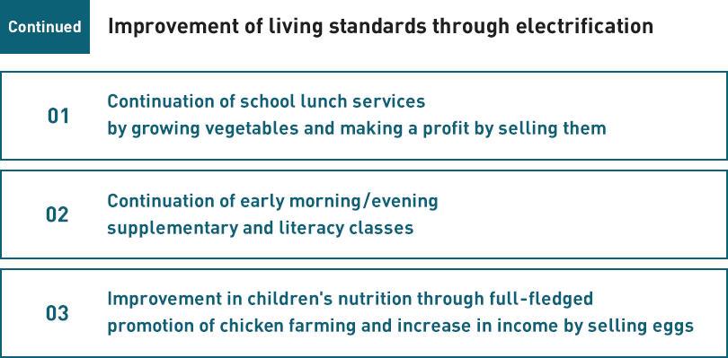 "I want to grow vegetables and fruit with water from the creek using an electric pump." "I'd like to raise chickens efficiently using incubators." Many of the villagers are saying how they hope to raise their incomes by using electricity. There are hopes for models to be made for local industry involving the residents.