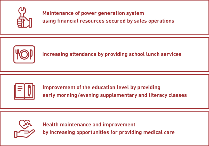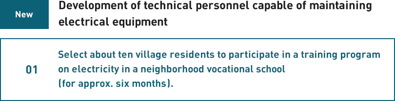 From now on, we will develop maintenance technicians capable of examining equipment malfunctions, carrying out repairs as necessary, and analyzing the causes of the problems. If community residents acquire such skills, then they will be able to minimize repair charges paid to electrical contractors.