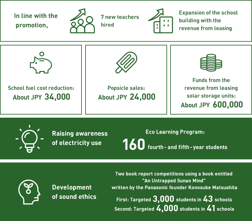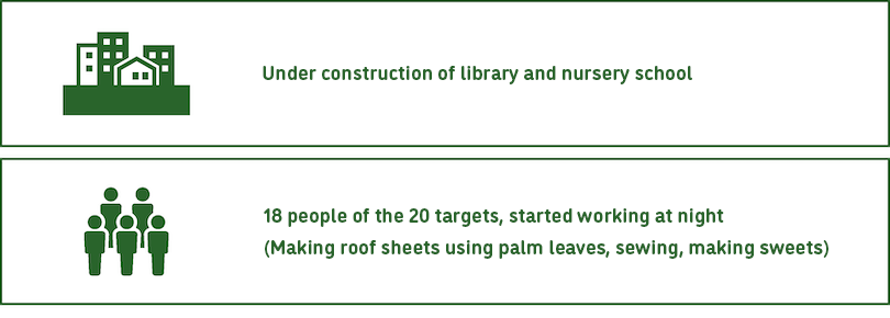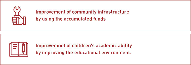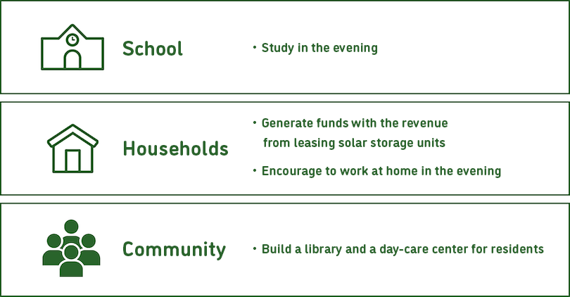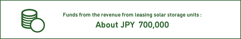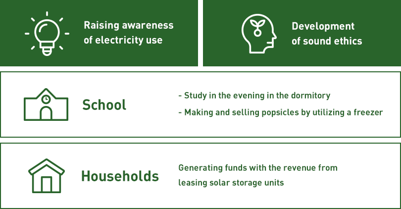 Solar storage systems are provided to all households in the village aiming to improve children's learning environment in the evening and help increase income by allowing working at home longer into the evening. In addition, a solar storage rental system was launched to use the accumulated rental fees for improving the education environment, including the construction of a school library.