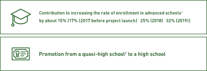 Toward the goal of making a social impact by achieving sustainable growth in communities, we designed activity processes mainly targeting children. In the Baingbin Senna Village, through the use of electricity supplied from photovoltaic and energy storage systems in the dormitory of the village-run school, students have now become able to study later in the evening. Our efforts yielded positive results including a contribution to increasing the rate of enrollment in advanced schools1 by about 15%. In the Thaung Thone Lone Village, through the generation of funds with the revenue from leasing solar strage units, we constructed common facilities in the village.