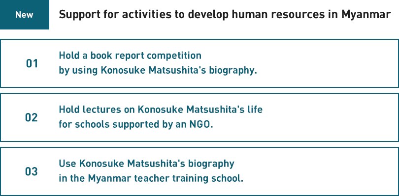 Our activities will focus on supporting the development of human resources in Myanmar. We will use a biography of Panasonic's founder Konosuke Matsushita as educational material and providing teachers in training as well as students with opportunities to learn new ways of achieving success.
