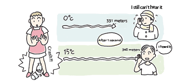 First of all, sound is not instant. It has a speed, which is called the speed of sound. Sound travels in air at a speed of around 331 meters per second. This speed is called Mach 1. This is the speed of sound at 0 degrees Celsius. But for each degree of Celsius increase in temperature, the speed of sound speeds up by 0.6 meters per second. So the warmer it is, the faster sound travels. And the colder it is, the slower sound goes. This effect is caused by the movement of air. The warmer the air, the livelier it moves. The colder the air, the more sluggish it moves. So on chilly days, it’s harder for sound to travel.