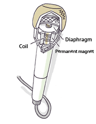 When you speak into a microphone, you voice gets bigger. But how does it work? A microphone, or mic, is a device that changes sound waves that are carried by air into electric signals. Air inside the microphone transfers the incoming sound waves into electricity. This is how sound waves are transformed into electric signals. Once sound waves are made into electric signals, the sound can be made louder by changing the strength of the electric signals. The electric signals can also be passed along electric wires to places far away. The device that does this is a power amplifier, or power amp.