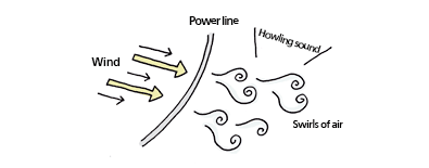 No doubt you have heard howling sounds on days when the wind is blowing hard. Those must be the sounds of the wind, but where exactly do they come from? You can hear the wind because it makes swirls of air. Strong winds split into different air streams whenever they run into a wall or power line. These air streams curl around the object they hit and spin. This spinning makes swirls of air. These swirls keep forming and disappearing as long as the wind blows. The swirls that form and disappear in this way create air vibrations that make the howling sounds.