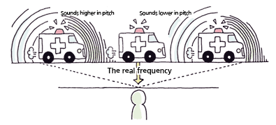 The pitch of a sound — whether it sounds high or low — is decided by the number of vibrations per second of the air transmitting the sound. The more vibrations per second, the higher the pitch. The fewer the vibrations, the lower the pitch. When an ambulance’s siren approaches you, the air waves get pushed together by the speed of the ambulance and the number of vibrations per second that reach your ear steadily goes up. This makes the siren sound louder and higher in pitch. Once the ambulance passes you by, the air waves get further apart and the number of vibrations per second goes down. This makes the siren sound quieter and lower in pitch. So the sound changes from a higher pitch to a lower pitch based on where you are standing. This change in pitch is called the Doppler effect.