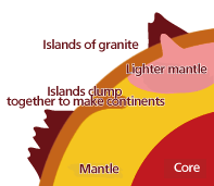 Several hundred million years after the Earth was formed, an even hotter core formed in the center of the Earth. The super-hot core heated the mantle, which made the mantle lighter and caused it to rise up. This mantle was cooled at the ocean floor and became plates, or bedrock. These plates moved with the flow of the mantle and collided with other plates. At the boundaries where plates collided, lots of islands were formed. The islands were made of a light rock called granite. It’s thought these granite islands collided and clumped together, eventually creating continents.