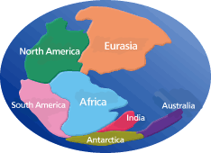 Take a good look at a world map or a globe. If you moved North and South America and placed them beside Africa, can you see how neatly they would line up? About 220 million years ago, all of today’s continents were joined together in one super huge continent. It’s believed cracks formed in the super continent and the pieces slowly drifted apart. Over time, these pieces moved into their current shape.