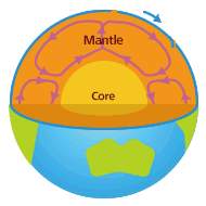 If we go down deeper toward the center of the Earth, we will reach a layer called the mantle. The mantle is like the white part of an egg. Going farther down beyond the mantle, we will reach the core, which is like the yolk of an egg. The core is molten and is said to be as hot as 6,000 degrees Celsius. The mantle is made of rock. When rock in the mantle is heated by the core’s extreme heat, the rock becomes lighter and rises. When the rock cools, it becomes heavier and sinks. This process is called convection. It’s why rock in the mantle is always moving. As the mantle moves, land on the surface also moves little by little. It’s like the land is dragged along by the mantle.