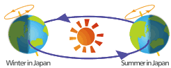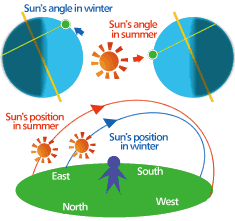 The sun’s height in the sky and where it rises and sets changes, depending on the season. On the day of an autumnal equinox or a spring equinox, the sun rises in the true east and sets in the true west. Daytime and nighttime are exactly the same length on these days. On the day of a summer solstice in the northern hemisphere, the sun is at its highest in the sky and daytime is the longest. This is why summers are hot. On the day of a winter solstice, the sun is at its lowest in the sky and daytime is the shortest. This is why winters are cold.