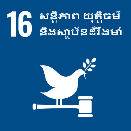 គោលដៅនេះគឺដើម្បីបង្កើតសង្គមដែលមានសន្តិភាពនិងមានលក្ខណៈរួបរួមដែលគ្រប់គ្នាអាចប្រើប្រាស់ច្បាប់ (តុលាការនិងនីតិវិធីច្បាប់) និងធ្វើឲ្យប្រាកដថាស្ថាប័នយុត្តិធម៌មានភាពសកម្មក្នុងកម្រិតសហគមន៍ ប្រទេស និងសាកលលោក។