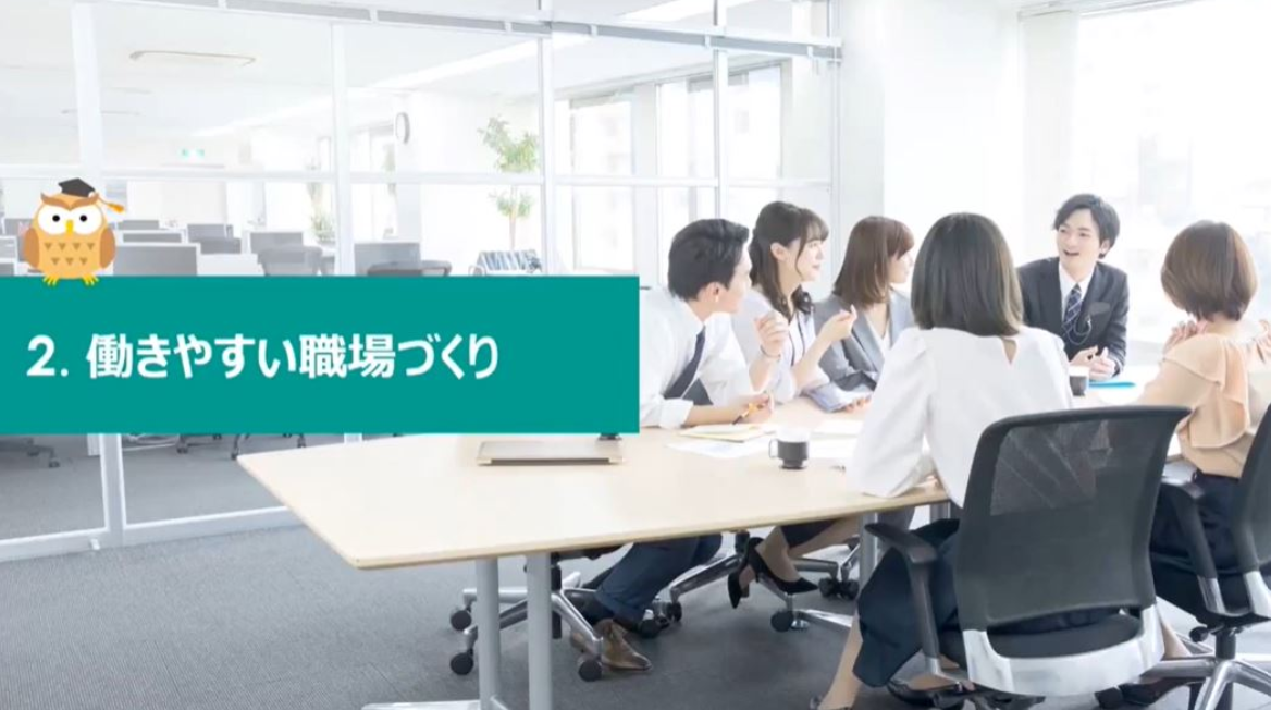 We also promote working environment improvements such as floors without steps or dips, lighting that is sufficiently bright, and unassigned desk space in an open office format.