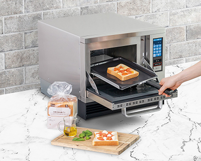 It is difficult for cafes and other restaurants to expand their light meal take-out menus due to problems such as sales forecasting difficulties, food waste, and labor shortages. Panasonic, in collaboration with Pasco Shikishima Corporation (Pasco), has developed a special cooking program and menu. We are offering food solutions for restaurants by combining our microwave convection ovens with Pasco's baked then frozen breads and pastries. Our original technology eliminates the natural thawing process, which normally takes about two hours, and produces fresh-baked deliciousness in a short amount of time straight from the frozen state. This eliminates the need to defrost bread in advance based on the predicted number of visitors, contributing to the reduction of food waste.