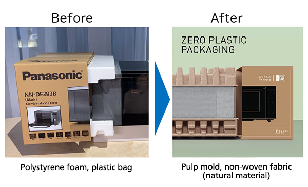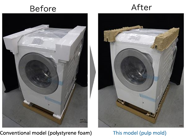 | Eliminated polystyrene foam packaging through pulp mold development*8 *8 Through simulations at the design stage and tests using actual machines, we developed a pulp mold capable of transporting large products weighing over 80 kg. This makes it possible to eliminate polystyrene foam packaging for large home appliances. |