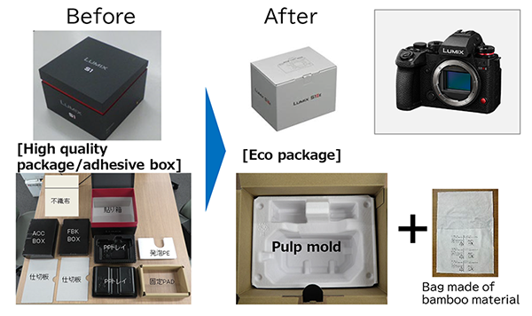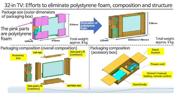 | Uses folded corrugated cardboard as a cushioning material to absorb impacts during transportation, eliminating polystyrene foam Approximately 71% reduction in amount of plastic materials used in packaging |