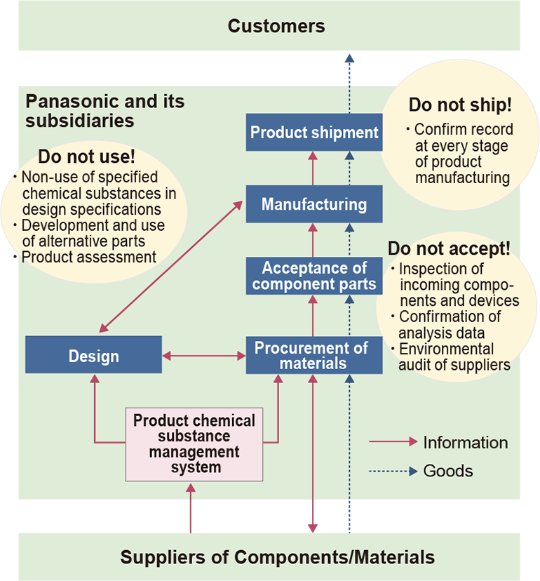 In order to definitely implement such activities described above, we issued our Chemical Substances Management Rank Guidelines that specifies prohibited chemical substances and management substances concerning products and activities at factories. We request to take actions to the chemical substances in accordance with the guidelines, not only to Companies in the Panasonic Group, but also to our suppliers. In fiscal 2013, we added Level 3 of prohibited substances to the category of the Chemical Substances Management Rank Guidelines (For Products).