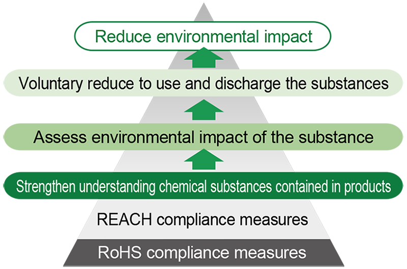 To minimize the environmental impact of chemical substances contained in products, we endeavor to identify chemical substances used in the components and materials of our products. In addition, for substances that are prohibited in products in major developed countries because of laws and regulations such as the European RoHS Directive, we manage the substances not to be used and/or contained in our products by designating them as prohibited substances except the substance for specific usage which is unavoidable to use its substitution. We will also conduct environmental impact assessments for the managed substances contained in our products. As for a substance whose impact on human health and/or the environment cannot be ignored, we plan to reduce or prohibit use of the substance.