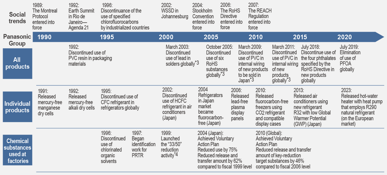 Meanwhile, as represented by the enforcement of the REACH regulation*2 in the European Union, the world implemented measures toward the goals agreed at the World Summit on Sustainable Development (WSSD) held in 2002, which is to produce and use all chemical substances in a manner that minimizes their impact on human health and the environment by 2020. Although the subsequent discussion was delayed as the conference could not be held due to the COVID-19 pandemic, in the fifth International Conference on Chemicals Management (ICCM5) held in in Germany September 2023, a new international framework that succeeds the activities up to 2020 was discussed; concerning appropriate chemical management, a new international framework for voluntary and diverse actors to be involved was formulated. Panasonic Group has been supporting the precautionary approach proposed in the Rio Declaration at the Earth Summit in 1992, and has continued its efforts for appropriate chemical management on a global scale even after 2020 that is the final target year of the WSSD framework. Furthermore, in order to continue implementation of product manufacturing in line with our basic policy of reducing the use of chemical substances that might adversely affect human health and the environment throughout their lifecycles, we determined chemical management as one of our continuing issues, and we are constantly working to reduce environmental loads of the chemicals used in our business activities and products. As for concrete activities, we have worked to comply with relevant regulations such as EU RoHS as a matter of course. In addition, we have worked to reduce adverse environmental impact originated by our group products as much as possible by (1) trying to understand hazardous substances contained in our products, (2) evaluating these substances on their environmental impact, and (3) voluntarily reducing or discontinuing their use in case of any environmental risks of the substances. We will continue to implement appropriate chemical management of such chemical substances while monitoring global environmental trends.