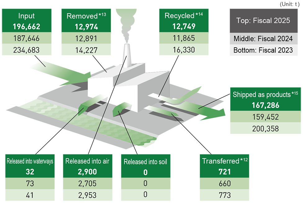 *12 Includes substances transferred as waste, as well as those discharged into the sewage system. Recycled amount which is free of charge or accompanies treatment cost under the Waste Management Law is included in "Recycled." (Different from the transferred amount reported under the PRTR Law.)