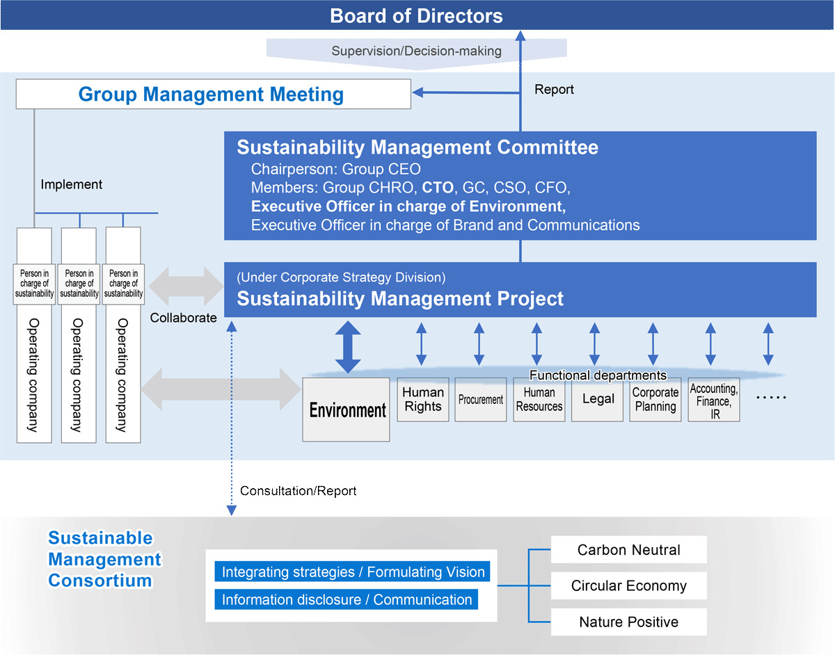 Initiatives on global environmental issues, which are seen as medium- and long-term issues for the entire Group, are becoming increasingly important and urgent each year. In order to accelerate decision-making and action, highly efficient information sharing and coordination across business fields has become vitally important. In addition to specialized committee activities on such as chemical substance control and CO2 reduction at manufacturing factories, the Sustainable Management Consortium, a groupwide community that voluntarily gathered to solve sustainability issues, was established in 2020 (approx. 1100 participants as of June 2025).