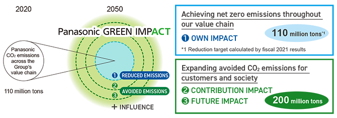 At present, the biggest obstacles preventing us from achieving our mission are global environment issues. In order to reduce depletion of limited natural resources and urgent problems caused by climate change or global warming as much as possible, it is indispensable to take actions to realize a carbon-neutral society (limiting the increase of global temperature to less than 1.5°C) and circular economy business systems. Panasonic has acted promptly to fulfill our corporate responsibility and contribution (ACT). Based on our strong determination to lead to solutions, we announced the Group's long-term environmental vision "Panasonic GREEN IMPACT (PGI)" that leads to achieve much greater contribution to definitely solve such problems in January 2022.