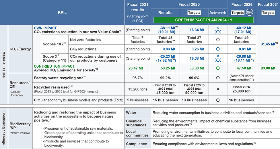 GIP2024 specifies a range of priority issue KPIs*7 including those for OWN IMPACT, the number of net zero factories, CONTRIBUTION IMPACT, factory waste recycling rate, expansion of recycled resin use, and the number of new circular economy business models.