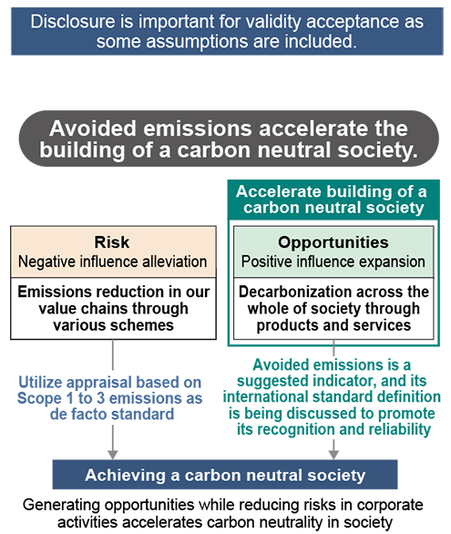 Under the current GHG Protocol, it is possible to evaluate CO2 emissions from our business activities; however, it does not take into account the contribution to society through our business (opportunities, i.e., business chance) as of now. On the other hand, although there is a concept of the avoided emissions, in reality awareness of the avoided emissions is still low in society and no uniformed standard for the avoided emissions has been established. Therefore, it is a must to establish a structure to facilitate and encourage respective corporations efforts to decarbonation (technical development and innovation), as well as to contributes to the acceleration of the realization of a carbon-neutral society by preparing environment where respective corporation's contribution to decarbonization is properly evaluated.
