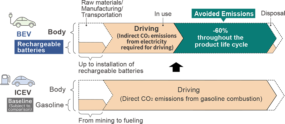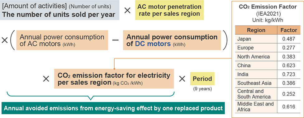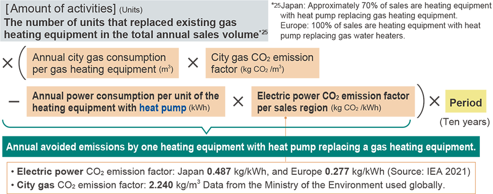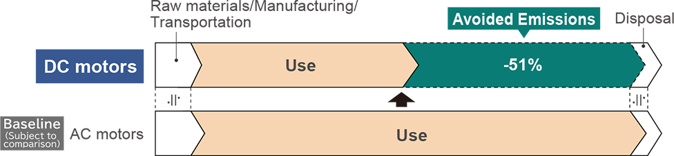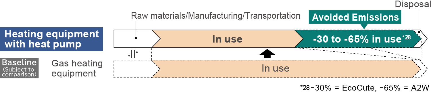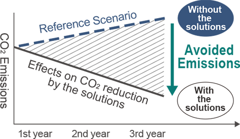 The amount of avoided emissions is calculated as the difference between before and after the introduction of a new technology, product, or service (hereafter, product), and refers to emissions across the product's entire life cycle, as well as from connected products and services. In the calculation, we set a hypothetical baseline scenario in which the new product is not introduced, and calculate the difference between emissions in the baseline scenario and those in the scenario where the new product has been introduced (emissions are not limited to the product's running time). When a company promotes the widespread use of its products, the emissions that would have occurred if the product had not been introduced are expressed as "Avoided Emissions."