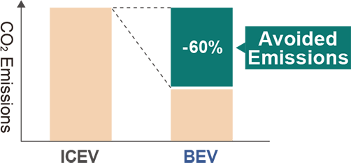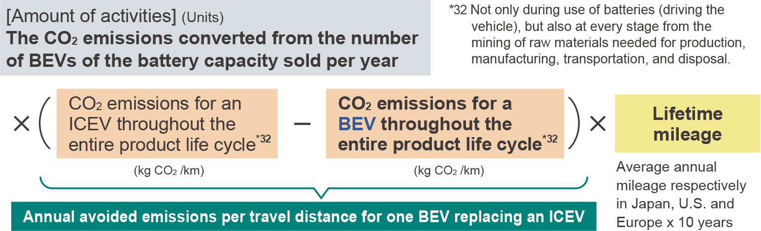 In fiscal 2024, we altered the emission calculation method for the automotive lithium-ion cylindrical battery series, which generates the greatest avoided emissions in the Group, to a life cycle-based method for better accuracy (only the running time was used in the conventional calculation). This change lowered the avoided emissions volume per battery.