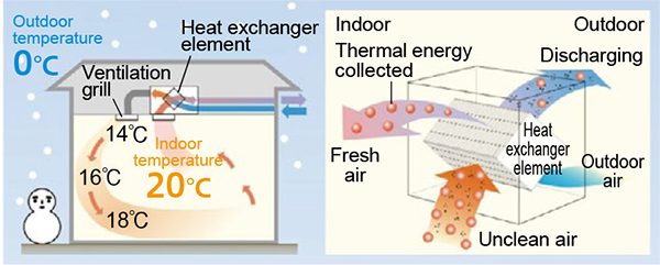 To achieve decarbonization in the consumer and business sectors, it is important to reduce environmental impact from air conditioning at living spaces in houses and offices. Energy Recovery Ventilators (ERV) System reduces heat loss from the interior of buildings and provide comfort maintaining appropriate air quality at the same time. ERV System exchanges heat of indoor and outdoor with a heat exchange element during ventilation and either heat or cool the air before being taken into the building, which reduces air conditioning load. Moreover, the system is equipped with air purifier that is a high performance system. Therefore, ERV System is used in wide areas in residential, commercial, and office buildings, where high air tightness is required including Japan, the U.S., Europe, and China.