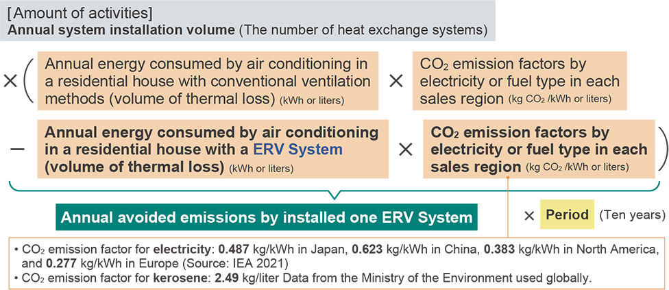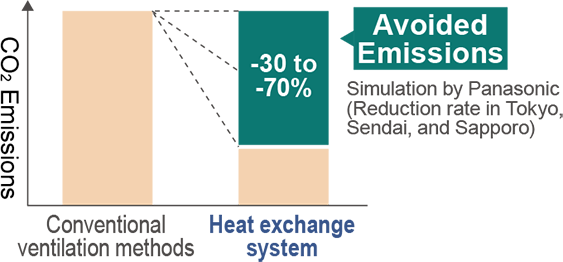 We then determined the difference in the volume of energy consumed by system operation for air conditioning in living spaces between the conventional ventilation method and the energy exchanged method, and multiplied it by the CO2 emission factors for electricity or fuel*36 by each sales region.