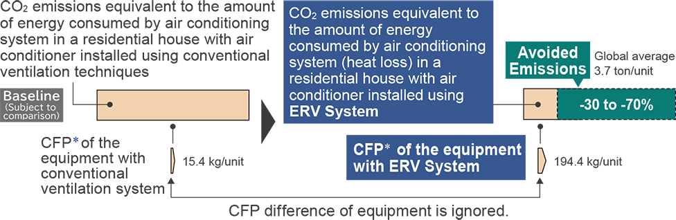 Difference in the heating and cooling load of the house before and after installation of the heat exchange system (this product). The CFP* for this product is greater than for a conventional ventilation system; however, the equivalent CO2 emissions from the difference in the heating and cooling load in a residential house before and after installation of a heat exchange air system is small (our calculation). Therefore, we decided that the effect can be ignored.