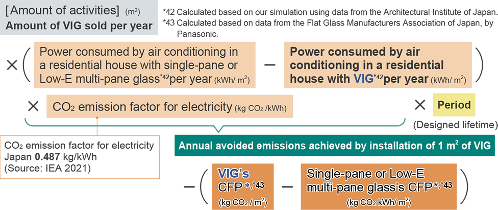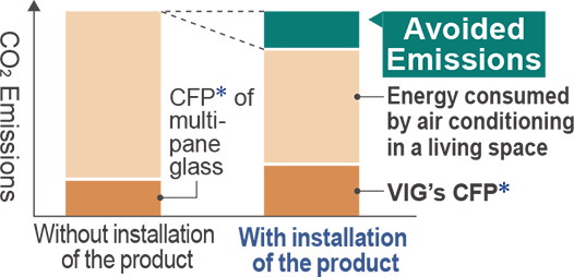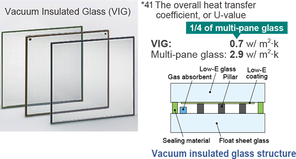 Vacuum insulated glass (VIG) shows significantly higher thermal insulation compared to those of single-pane glass and Low-E multi-pane glass.*41 CO2 emissions converted from the reduced amount of power of electricity required for operation of air conditioning equipment by installation of the VIG for glass material of buildings.
