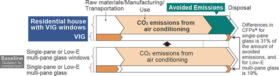 The difference between the CFPs* from VIG and single-pane glass is 31% of avoided emissions, and the difference between VIG and Low-E multi-pane glass is 19% of avoided emissions. These differences were subtracted from the avoided emissions, instead of ignoring them.