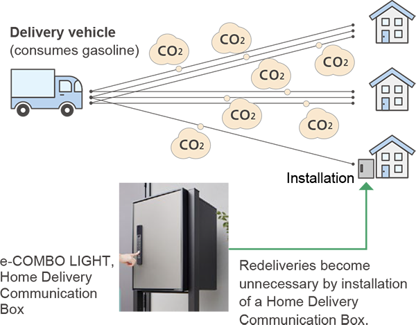 In the household business sector in Japan, because of increase in e-commerce trading and increase in the time when none is at home along with changes in lifestyle, load for distribution on couriers is on increase as the number of redelivery of goods increases. Installation of a Home Delivery Communication Box at home can avoid redelivery of goods, lowers the burden for the parcel receivers, and decreases the working hours of couriers workers. At the same time, it reduces CO2 emissions from energy consumption such as fuel for deliveries, which contributes to reduction of load in local distribution networks and decarbonization.