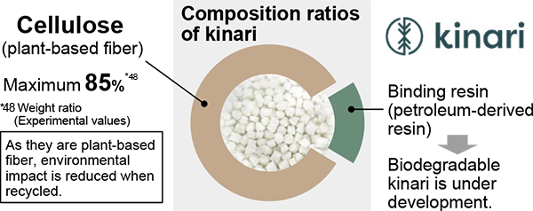 One of the solutions to this issue is replacing the resin components with bio resin, which is made from corn and other materials. Nonetheless other problems still remain, such as the impact on food production and occasional issues with functionality. Our high concentration cellulose fiber molding material, kinari, is made from plant-based materials such as forest thinning timber and industrial wastes, and has a competitive advantage due to its better density, strength, and price compared to other fiber materials. Kinari can contain up to 85% cellulose fiber, yet it is lighter than petroleum-derived resin. It can also be shaped by existing molding machines. Increasing use of kinari should contribute to building a circular economy and achieving carbon neutrality.