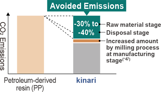 The difference between CO2 emissions*49 across the life cycle of a standard PP resin molding and that of a kinari molding.