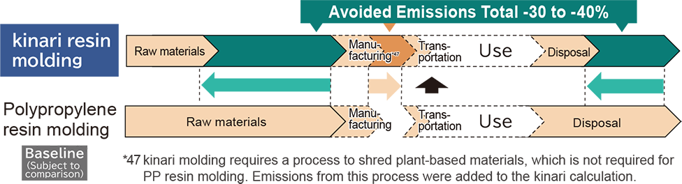 Compared to a standard petroleum-derived resin molding, a kinari molding can offer a CO2 emissions reduction effect in the phases of material procurement and molding disposal. Although kinari requires the shredding of plant materials, even taking account of the impact from such shredding, kinari molding’s CO2 emissions across its life cycle are smaller than those from petroleum-derived molding.