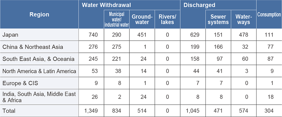 As risks of extreme water shortages is becoming higher as one of social issues, the Panasonic Group has been working to conserve water resources both in its products and production activities, in order to fulfill its social responsibility and to reduce risks in the management. Our Environmental Policy sets that we make efforts to conserve water resources by using water efficiently and preventing water pollution. We are working hard to reduce water usage in our business activities and through our products and services by setting water resource conservation in Our GREEN IMPACT PLAN 2024+1 as one of the continuing efforts.