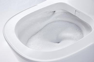 The Arauno, a fully automatic cleaning toilet that washes with foam every time it is flushed, uses water efficiently using a unique water-saving technology called the Turn Trap System, which reduces the amount of water used annually by approximately 40% *4 compared to conventional toilets. In addition to using a new organic glass-based material that does not easily stick to stains, the Triple Stain Guard, which reduces stains, reduces the number of cleaning times, thus saving water when cleaning.