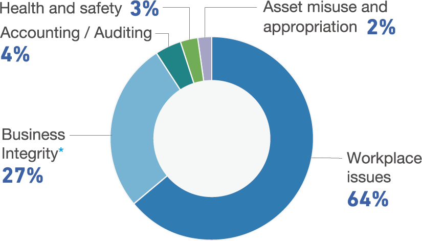 *2 The definition of "Workplace issues" includes harassment, sexual harassment, bullying, discrimination, unfair treatment, complaints, and others. The definition of "Business integrity" includes bribery, conflicts of interest or receiving any improper benefits, fraud and theft, competition law and antitrust, product quality, data privacy and information security, and others. The figures in the graph are rounded to the nearest whole number.